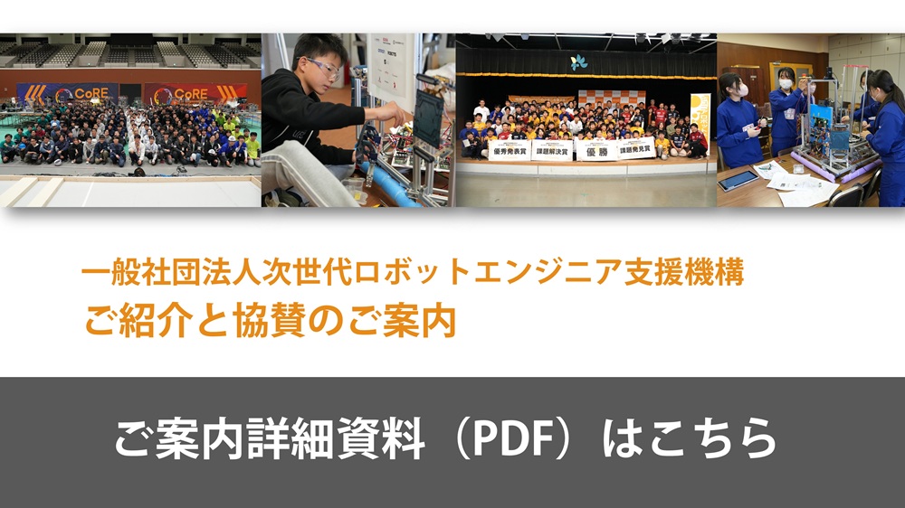 企業・団体賛助会員 募集案内 次世代ロボットエンジニア支援機構では本邦の科学技術振興のため、次世代のエンジニア「挑戦的共創人材」の育成、そしてエンジニアの裾野拡大の実現にご賛同いただいた企業・団体様からのご支援を募集中です。皆様の篤いご賛同とご協力をいただけますお願い申し上げます。 次世代ロボットエンジニア支援機構では本邦の科学技術振興のため、次世代のエンジニア「挑戦的共創人材」の育成、そしてエンジニアの裾野拡大の実現にご賛同いただいた企業・団体様からのご支援を募集中です。皆様の篤いご賛同とご協力をいただけますお願い申し上げます。 ご支援のご案内 下記の表の通り、ご支援に応じて様々な御礼を用意しております。各御礼の詳細は下記PDFも併せてご覧ください。 下記の表の通り、ご支援に応じて様々な御礼を用意しております。各御礼の詳細は下記PDFも併せてご覧ください。 種別Scrambleパートナーダイヤモンドゴールドシルバー Webページへ貴社名・ロゴ掲載大ロゴ中ロゴ小ロゴ小ロゴ 配付資料へ貴社名・ロゴ掲載大ロゴ小ロゴ文字のみ文字のみ 活動報告書のご提供、活動報告会へのご案内 ※1○○○○ エンジニア選手権でのVIP座席へのご案内 ※220名様まで10名様まで4名様まで2名様まで ユニフォームへ貴社ロゴ掲載 ※3特大ロゴ1地域、 もしくは大ロゴ3地域まで大ロゴ2地域まで中ロゴ1地域まで小ロゴ1地域まで ユニフォームのご提供 ※3最大3着最大2着1着1着 ロボットへ貴社ロゴ掲載 ※4特大ロゴ1地域、 もしくは大ロゴ3地域まで大ロゴ2地域まで小ロゴ1地域まで- Scrambleグッズのご提供2種3点ずつ2種2点ずつ-- 各種イベント時に貴社PR資料配付○○-- 協賛金100万円50万円25万円10万円 協賛金は消費税の課税対象外で、別途消費税を申し受けることはございません。この表の内容等については変更になる可能性もございますので予めご了承下さい。ご不明な点がございましたらお気軽にお申し付けください。※1 会場にお越しいただく際の旅費等はご負担をお願いします。※2 本機構が主催するエンジニア選手権において支援者様限定の観戦エリアをご用意いたします。観戦エリアは1部リーグのみのご案内となります。※3 本機構所属者がイベントなどで着用するユニフォームです。デザインの更新は1月頃の年1回を予定しております。ご提供数分以上をご希望の場合は有償でご購入いただけます。※4 ジュニアロボットチームで製作するロボットに貴社ロゴを掲載いたします。 ユニフォームへのロゴ掲載例 ユニフォームへのロゴ掲載例 ロボットへのロゴ掲載例 ロボットへのロゴ掲載例 ご支援の方法 お申込方法として①契約書を作成して調印する形式と、②寄附申込書を頂戴する形式の2つをご用意しております。ご不明点がございましたらお気軽に下記お問い合わせフォームよりお問い合わせください。 お申込方法として①契約書を作成して調印する形式と、②寄附申込書を頂戴する形式の2つをご用意しております。ご不明点がございましたらお気軽に下記お問い合わせフォームよりお問い合わせください。 お問い合わせフォーム ①ご契約書の作成をご希望の場合 お問い合わせフォームより、ご契約書形式でのご協賛ご希望の旨をご連絡ください。 お問い合わせフォームより、ご契約書形式でのご協賛ご希望の旨をご連絡ください。 ②寄附申込書による申込をご希望の場合 下記の寄附申込書に必要事項をご記入いただき、お問い合わせフォームより送信をお願いいたします。 下記の寄附申込書に必要事項をご記入いただき、お問い合わせフォームより送信をお願いいたします。 寄附申込書ダウンロード